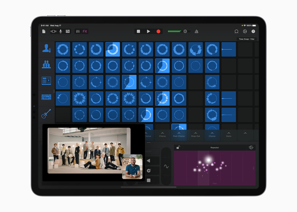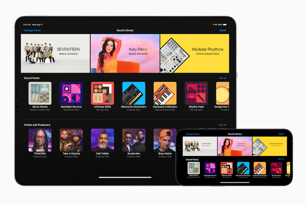 Katy Perry 和 SEVENTEEN 的「混音課程」可在 GarageBand「聲音資料庫」中免費下載,這個資料庫也包含種類繁多的免費循環樂段、聲音和樂器,提供混搭所需的一切工具,讓用戶能將原始歌曲帶往全新方向。使用 GarageBand 廣受歡迎的「即時循環樂段」介面混音,任何人都能快速為歌曲進行重新安排,並加入新的元素,同時讓一切與節奏和音高保持同步,而無須樂理專業知識。Remix FX 則讓混音更加多元,帶來各種過濾器和中繼器等工具,以協助創造極致效果。無論是要將 House 音樂徹底翻轉為嘻哈音樂,或混搭各種不同風格,GarageBand 使用者都能肆意揮灑創意。
