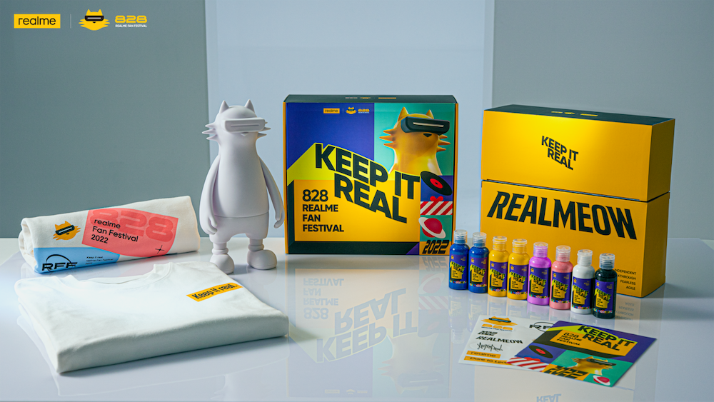 realmeow 作為稱職的 realme 首席潮流官,總是以不同的造型驚豔四方,演繹屬於 realme 的潮流故事,曾在中秋節以兔子造型亮相、在農曆年時以應景的老虎造型俏皮出鏡,更在 realme GT2 Pro 發布時以限定版 realmeow Paper 公仔現身。在屬於 real 迷的年度重磅節日─828 粉絲節中也不會缺席,realme 驚喜推出《828 限定版 realmeow─流體創作版》,以白色 realmeow 與流體顏料的組合,呼應「Keep It Real」口號,鼓勵 real 迷放膽創作,過很酷的人生。