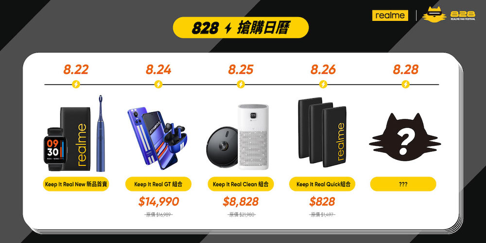 除了 realmeow 外,realme 亦於 realme 網路商店推出多款 Keep It Real 組合,從 8 月 24 到 8 月 28 每日 10:00 開放搶購。