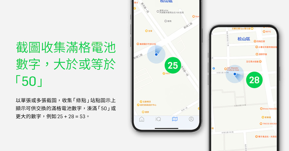為感謝 50 萬用戶的信賴與支持,達成全體用戶超越 3.2 億顆電池交換的里程碑,Gogoro Network 特別舉辦「來電 50,集綠點抽資費折抵」活動,邀請用戶於 8/24 14:00 ~ 9/25 23:59 間至全台「綠點」GoStation 交換電池,截圖該綠點站點可供交換滿格電池數字,上傳一張或加總數張截圖數字大於或等於「50」時,即可參加「每月資費現折 200 元 x 連續 25 個月」抽獎,活動總計將抽出 100 位幸運 PBGN 車主。