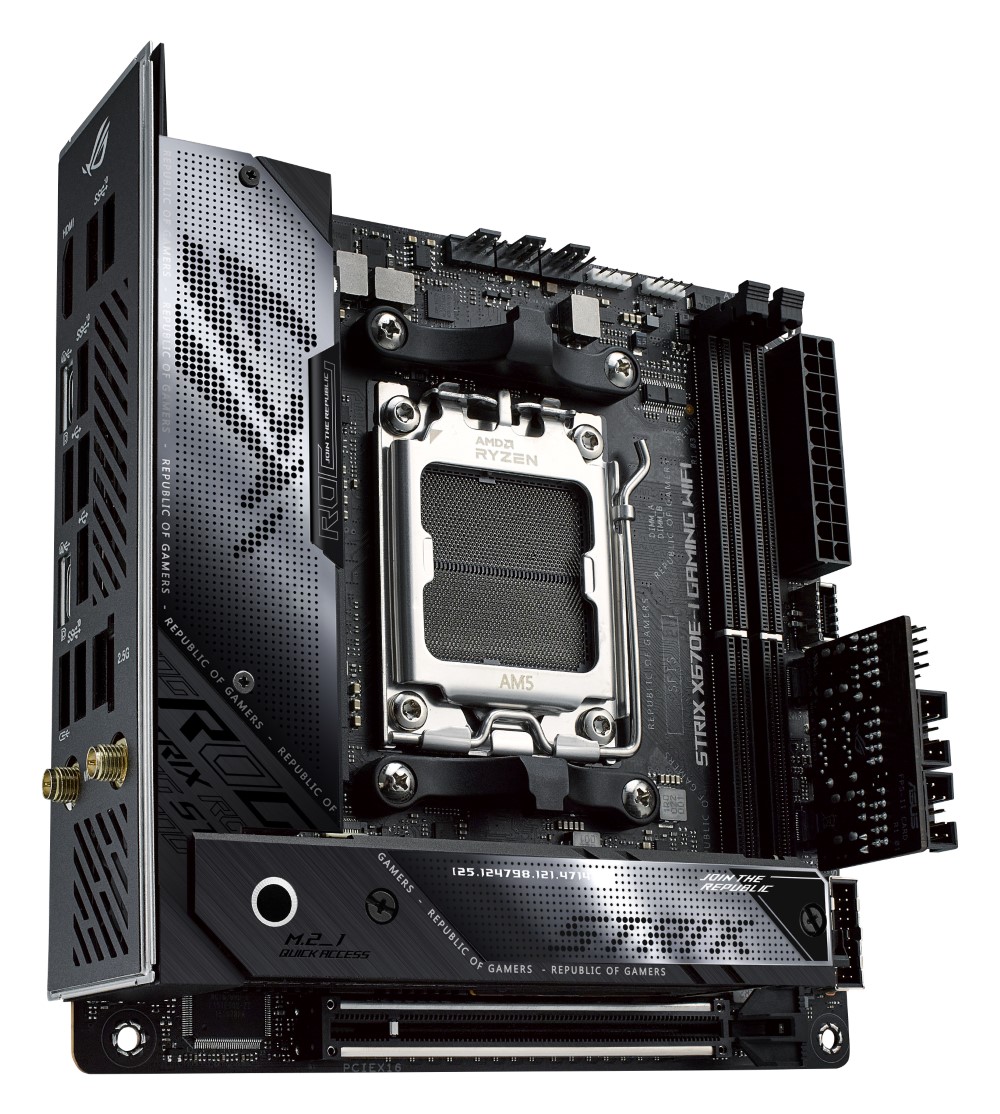 ROG Strix X670E-I Gaming WiFi Mini-ITX 主機板外型精緻小巧,內蘊強大效能足以打造新世代電競主機;除配置一個為最新顯卡準備的 PCIe 5.0 x16 插槽,更具備兩個 DDR5 DIMM 記憶體插槽,以及兩個 M.2 插槽(分別支援 PCIe 5.0 及 PCIe 4.0)。