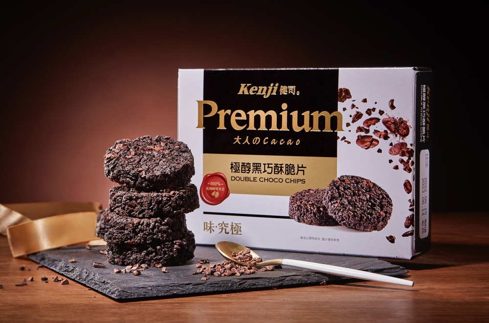Kenji 健司表示,秉持「真材實料好味道」的初衷,打造全新「極醇黑巧酥脆片」,可可用量比市售既有的巧克力脆片增加50%。包裝以低調奢華的深黑與燙金外裝,重新定義大眾對黑巧克力脆片的品味。喜愛巧克力的你,絕對不能錯過這款「極醇黑巧酥脆片」!