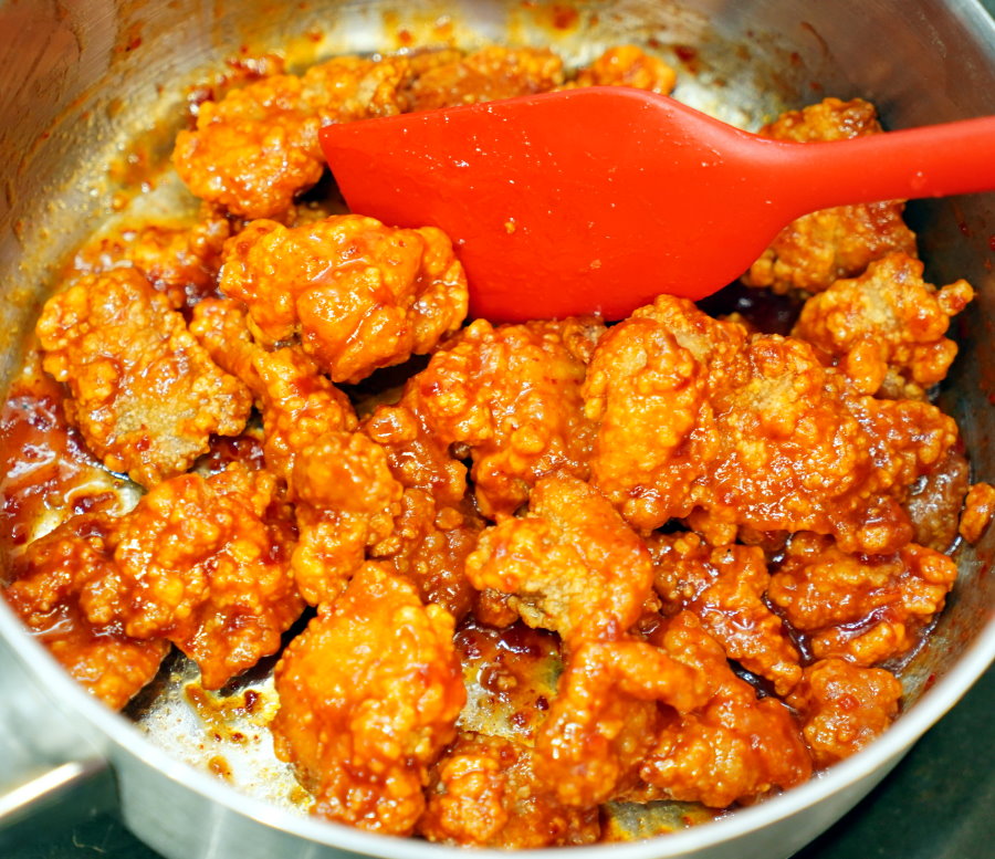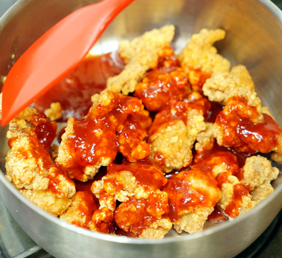 ▼接著將加熱好的無骨炸雞放進鍋中,開小火再加入醬料下去拌勻即可~~