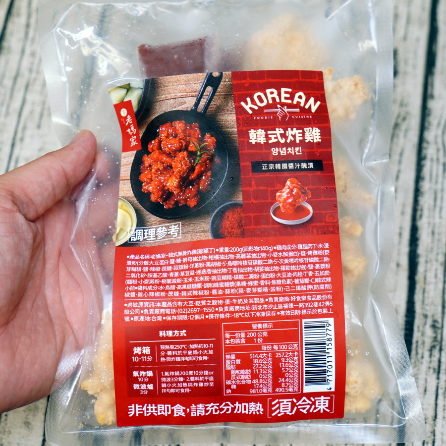 ▼沒想到老媽拌麵也有推出冷凍韓式料理,短期內不能去韓國也沒關係,來吃個老媽家韓式冷凍家常菜也能過過癮~~而且料理方式簡單快速,平均只要六分鐘就能輕鬆上桌!首先要來享用的是邪惡的韓式炸雞,覆熱方式很多元,可以先將烤箱預熱到250度,加熱時間約10~11分鐘,或是使用氣炸鍋200度10分鐘,或是直接微波3分鐘即可,也可用平底鍋小火加熱,再將醬料與炸雞拌勻即可享用!