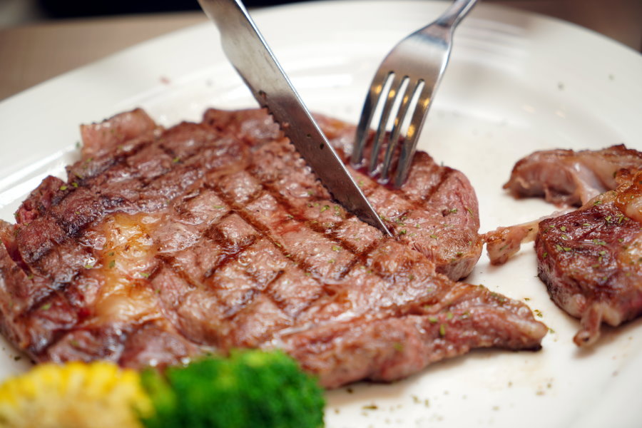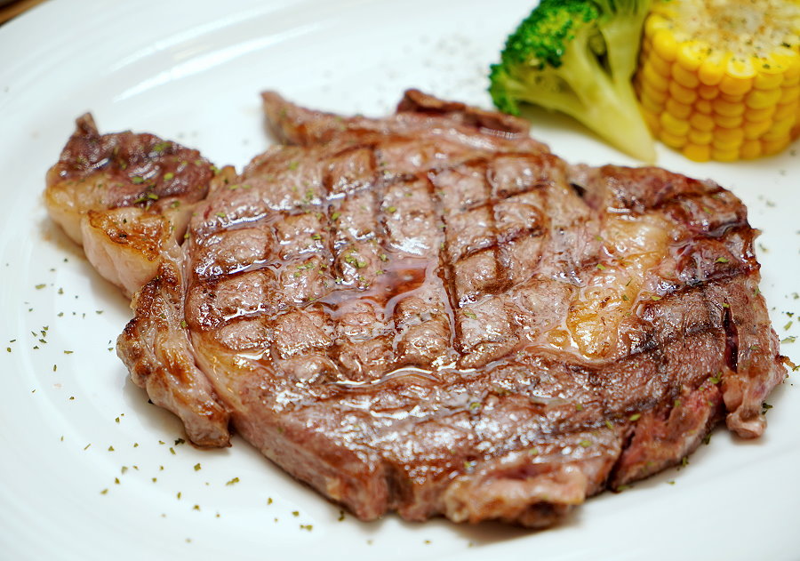 ▼厚切肋眼牛排,有別於一般牛排店採用鐵板上桌,這裡採用的是加熱過的瓷盤,因為無法藉由餐盤改變牛排的熟度,所以熟度就要更精準;熱盤的好處不僅可以讓牛排維持在一定的溫度,而且牛排也不容易出血水,摸起來溫熱又不會過燙,這是高級餐廳比較常見的出餐方式,在這裡不用花大錢也能享受得到!