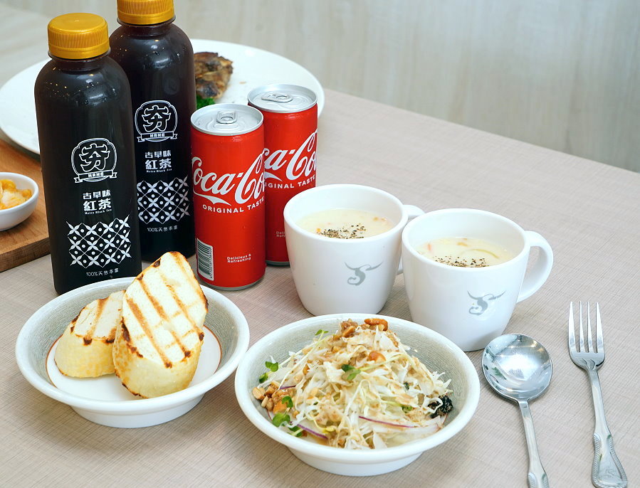 ▼主餐來之前,可以先來點沙拉、湯品墊墊胃,麵包是烤好的乳酪軟法,單吃也挺香的~高麗菜絲搭配堅果碎、胡麻醬,吃起來清爽又開胃,還帶點香脆的口感,很可以耶!飲料是紅茶、綠茶、可樂三選一,我們對古早味紅茶、可樂一向沒有抵抗力,就通通來一罐吧(笑)!