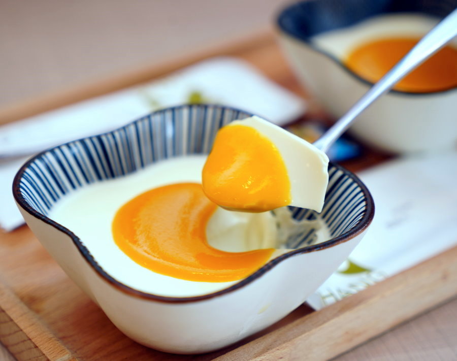 ▼細嫩滑溜、充滿奶香的奶酪搭配香甜濃醇的芒果果醬,酸甜與奶香非常平衡,搭配起來也滿不錯吃的!