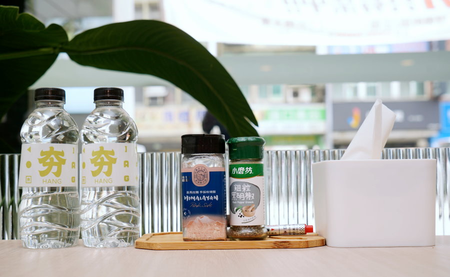▼桌上有擺放太夯水、玫瑰鹽、黑胡椒、衛生紙等用品,大家都可以自行取用~