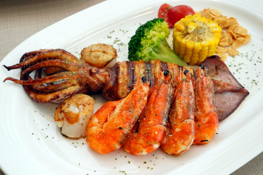 ▼沒多久主餐上桌啦~厚切肋眼海鮮盛合雙人套餐就是這麼澎湃,主餐包含12oz厚切肋眼+2顆干貝+4隻草蝦+1隻魷魚,一旁還有配菜跟蒜酥,加上兩款小菜、奶醬通心粉,光看就飽一半啦(笑)!