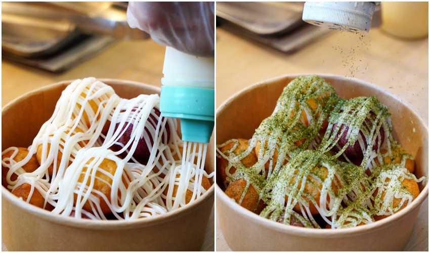 ▼綠油油(美乃滋+海苔粉),老闆娘真的沒在手軟,每一盒都這樣淋好淋滿~~酥香Q軟又香甜的地瓜球遇上香氣十足的海苔粉其實也挺合拍的,搭配美乃滋不僅更增添滑順口感,而且還能將海苔粉整個巴好巴滿,鹹甜交錯的滋味更加耐吃,一口塞進嘴巴裡真的是大大滿足啊!