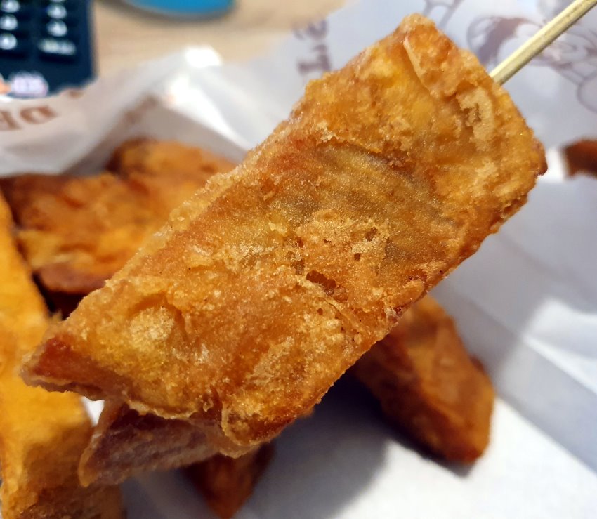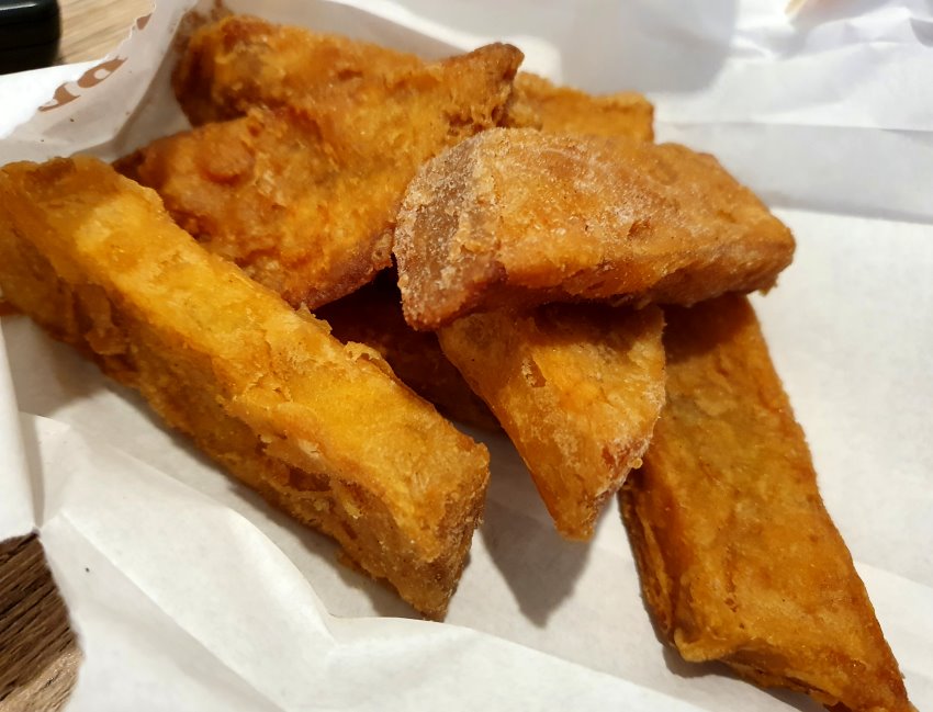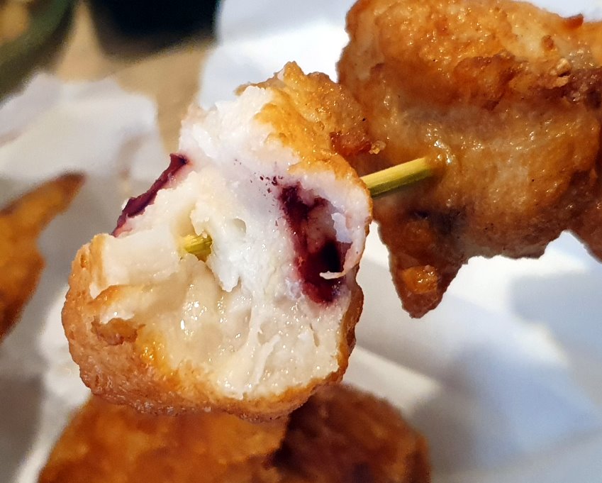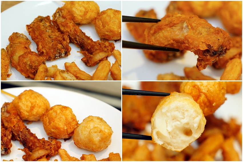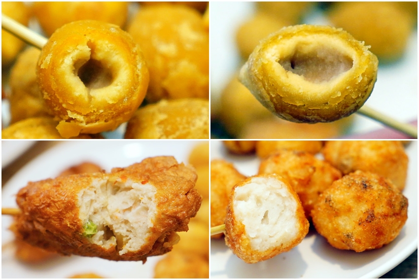 ▼地瓜球是走一種外酥內Q的路線,裡頭還有包裹餡料,吃起來皮厚QQ的,也不錯吃,但我們還是喜歡空心感的地瓜球(笑)!龍鳳腿吃起來鮮香美味,香Q紮實還帶有多種蔬菜的甜美,也沒有什麼油耗味!花枝丸也是走一種脆皮路線,外酥內彈還帶有花枝顆粒,吃起來也還不錯!