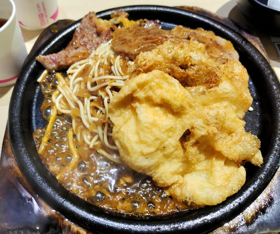 ▼水嫩牛排,有別於一般牛排搭配荷包蛋,這裡提供的是炸蛋,鐵板麵上頭還有一層厚厚的起司,光看就很迷人!