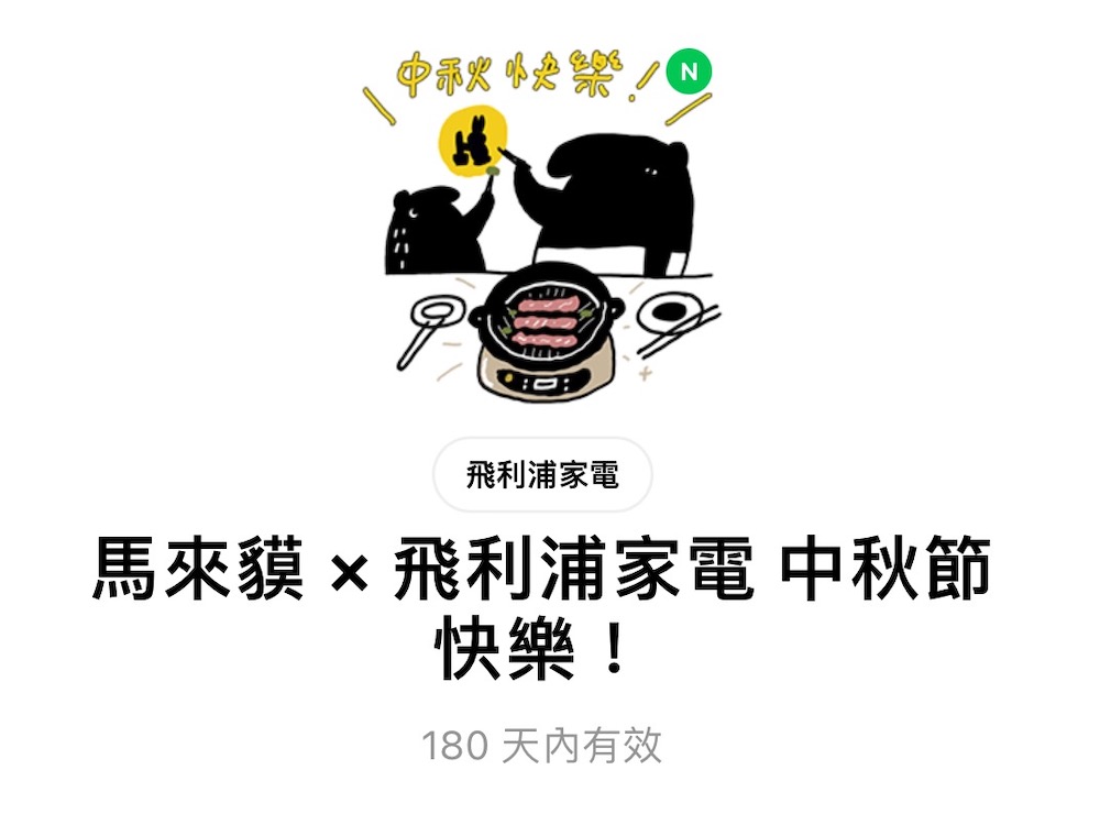 中秋節即將到來,飛利浦家電與國際知名插畫家 Cherng 合作,推出限定 LINE 貼圖「馬來貘x飛利浦家電 中秋節快樂!」,只要加入飛利浦家電 LINE 官方帳號就能獲得,還有家樂福與 OB 嚴選也推出限時中秋貼圖。