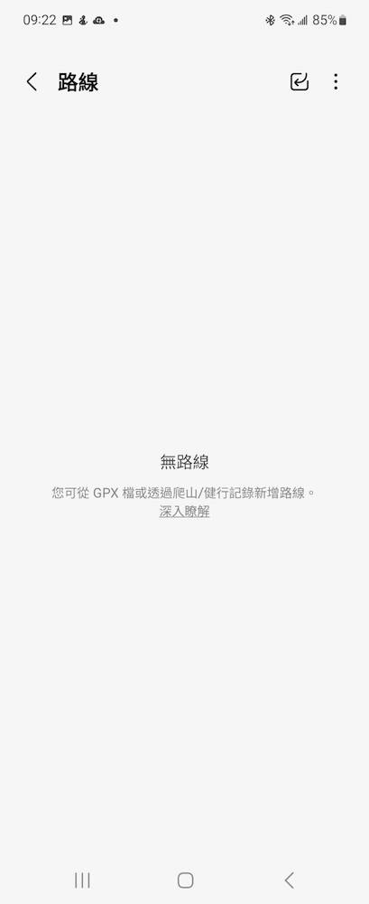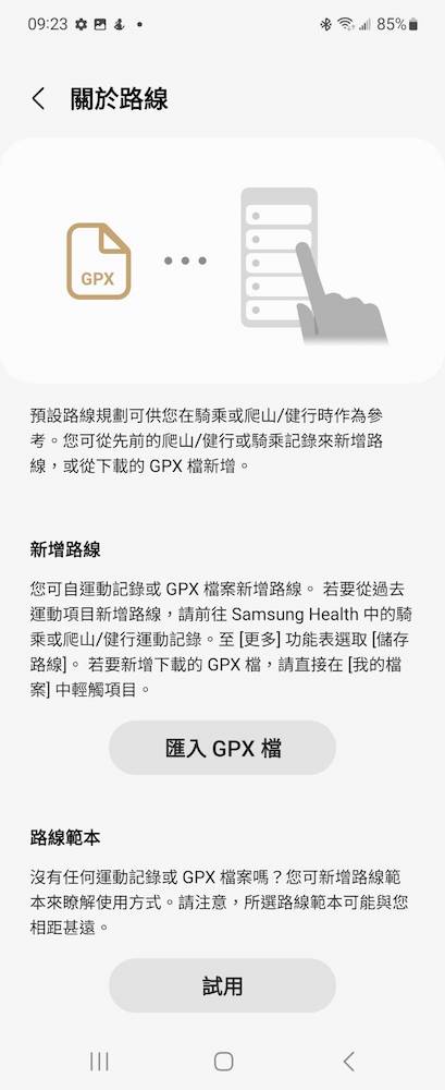 想要找尋爬山、健行、自行車離線導航地圖的朋友可以參考《健行筆記》中網友們分享的地圖後下載,接著只要從手機中的 Samsung Health app 中,「首頁」>>>「運動」>>>「爬山」右上角的「路線」中右上角的「…」裡有「關於路線」來匯入 GPX 檔案。