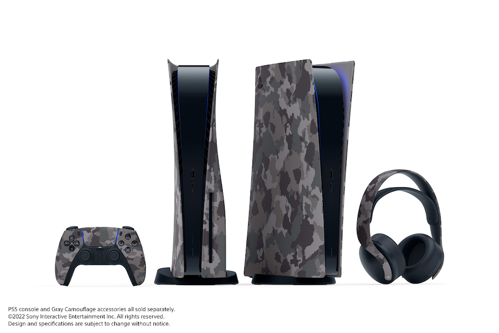 全新的迷彩設計,融入了 PlayStation 造型獨特代表性微粒紋理,讓 DualSense 無線控制器、PULSE 3D 無線耳機組、PS5 主機及 PS5 數位版主機的主機護蓋耳目一新。