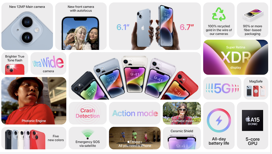 iPhone 14 與 iPhone 14 Plus 搭載的是 A15 處理器、共有黑、白、藍、紫、紅 5 個顏色,相機方面還是以斜角方式呈現,正面同樣維持了瀏海設計。
