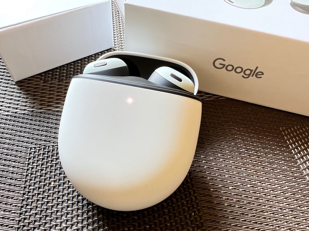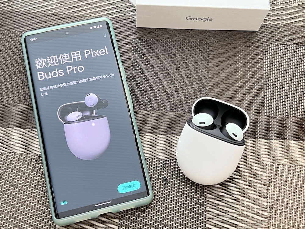 Pixel Buds Pro 這次台灣引進了迷霧灰和石墨黑兩色,其中迷霧灰的顏色雖說是灰色,但乍看下會覺得是帶著淺淺的綠色,充電盒外型更像是白色,相當的耐看。