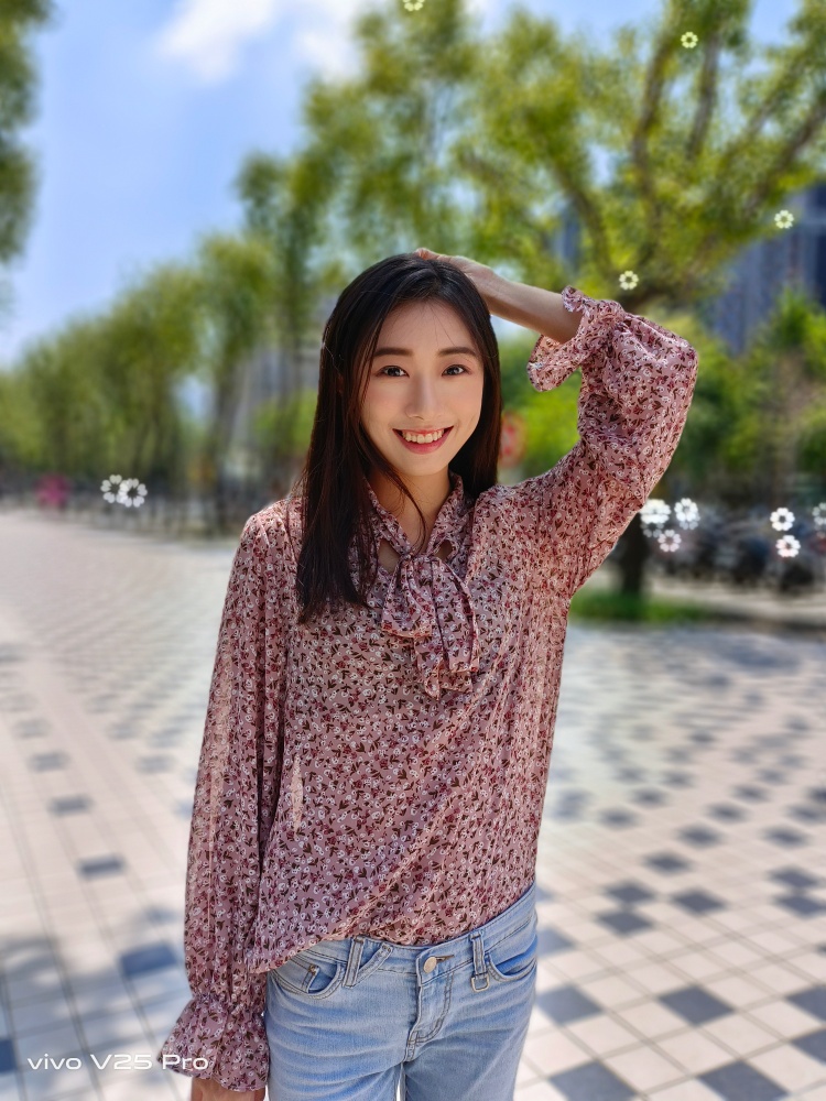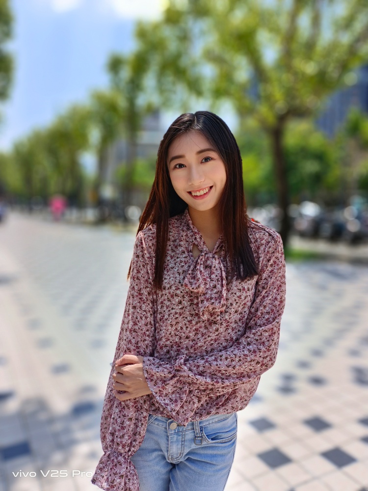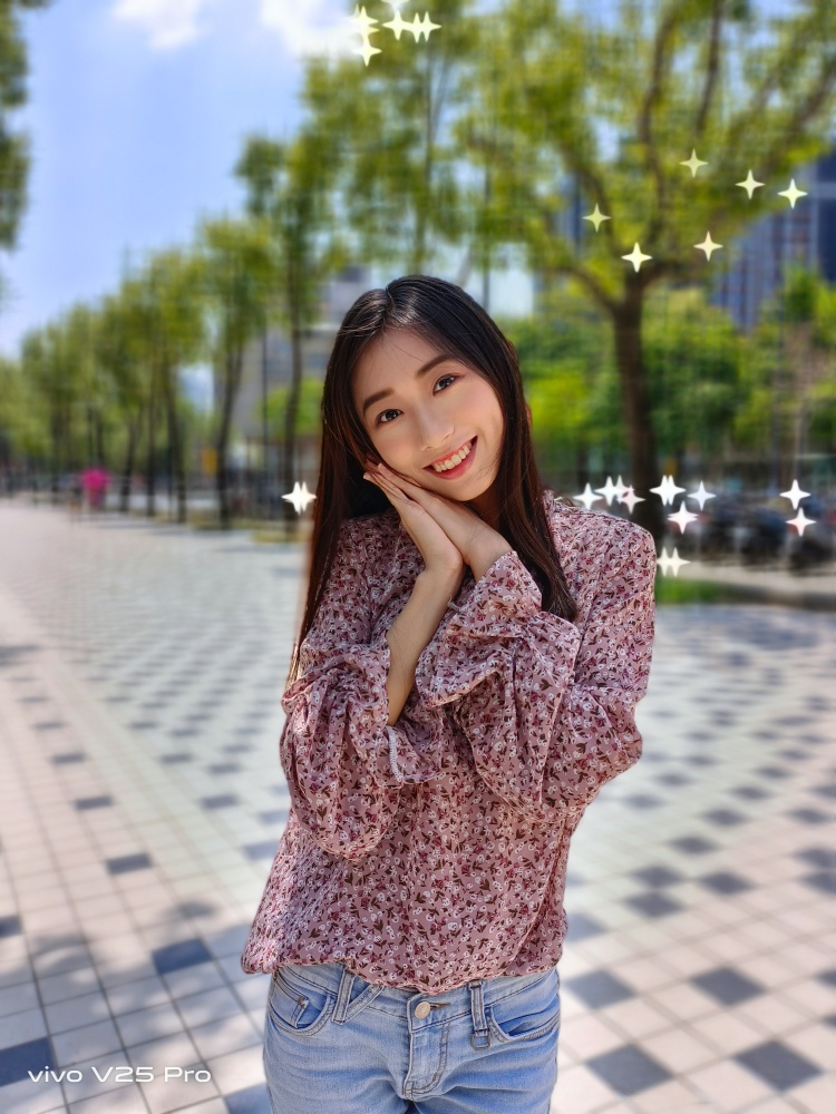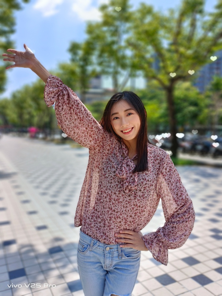 在人像拍攝功能中,vivo V25 Pro 提供非常多實用的拍攝模式,除了前面提到的夜景人像功能之外,還有人像虛化光斑功能,一般在拍攝人像模式時,背景通常只會有單純的虛化模糊效果,不過 vivo V25 Pro 為背景虛化的光點處加入了特效,光斑可以變成像是愛心、星芒、蝴蝶或是落櫻,增添一點可愛有趣的氛圍。