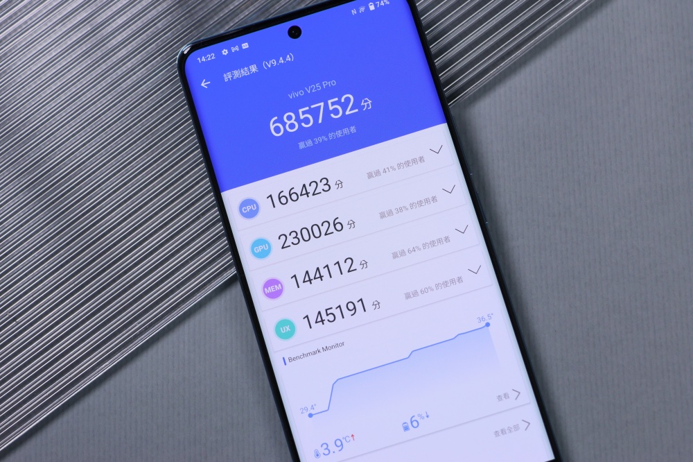 在看續航力之前先測試一下 vivo V25 Pro 的跑分表現,從安兔兔跑分也可以看到,在效能測試前後機身溫度上升幅度不大,之所以能達到這樣出色的溫控效果,最主要是這次 vivo V25 Pro 加入了超大面積的散熱結構,這次的散熱系統採用所謂「根系仿生散熱結構」,以植物的根系為靈感,透過石墨散熱膜、具備上百條精密工藝蝕刻出儲水凹槽的 VC 液體冷卻散熱板和絕緣散熱膜,搭配組合下來可以讓中心溫度比前一代更為降低,長時間遊戲下來也能維持高效率。