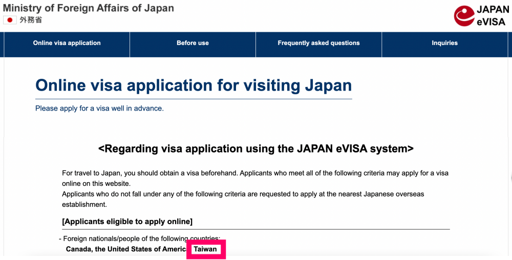 根據公益財團法人日本台灣交流協會的公告指出,目前外國人入境日本一率需要取得簽證,而目前針對台灣人可以申請的簽證有三種形式:商務目的、中長期居留目的(比如留學)、觀光目的。