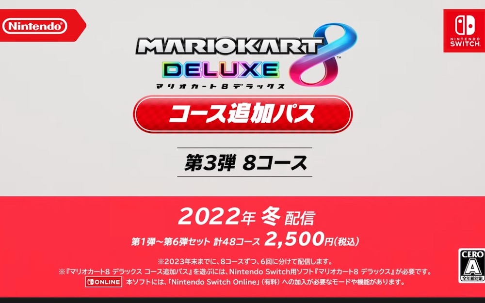 任天堂《瑪利歐賽車8 豪華版》在 2022 年 3 月推出了《瑪利歐賽車8 豪華版 新增賽道通行證》,預定分成 6 次發表,每次帶來 8 個賽道,於 2023 年末前合計會新增 48 個賽道。現在任天堂在線上發表會 Nintendo Direct 中預告將會在今年冬季帶來第三波 DLC。