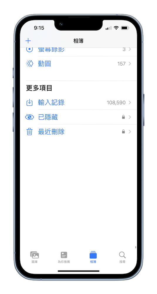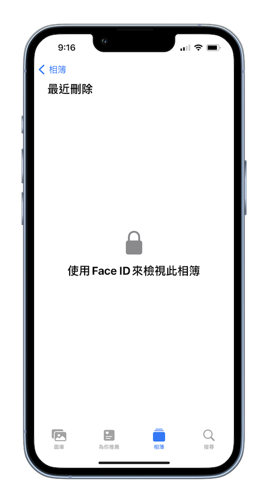 除了「重複的項目」相簿外,照片下方還會看到「已隱藏」與「最近刪除」這兩本相簿旁都上了鎖,如果想要打開還得使用自己的 Face ID 來解鎖,這也是 iOS 16 貼心的新功能,日後用戶就不用擔心想要隱藏的照片被別人 “不小心” 的打開囉!