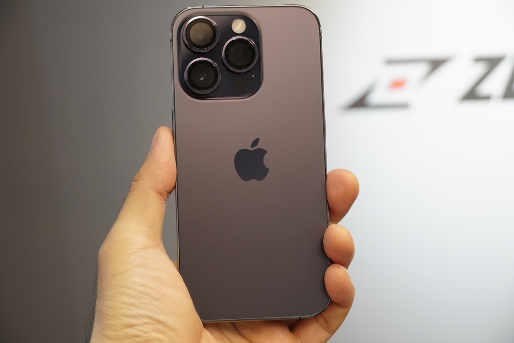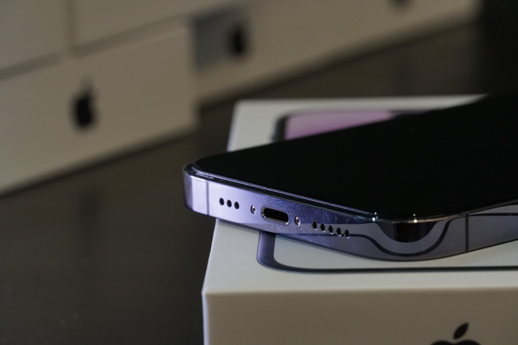 深紫色就是這次推出系列手機中最特別的顏色,雖說名為深紫色,但在光線下會呈現出不同的漸層,所以拍攝時也不太容易還原色彩。背蓋採用較不易沾染指紋的霧面材質,質感還不錯,中間那顆蘋果咬一口還是最容易沾到指紋的地方。