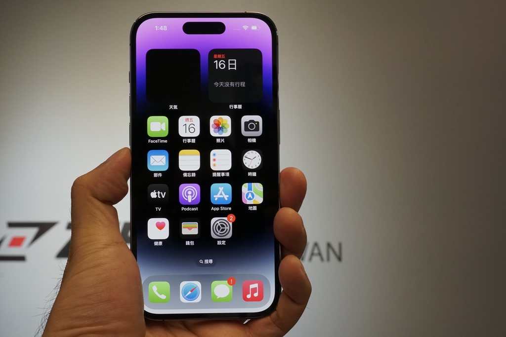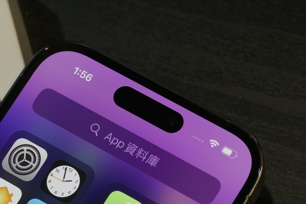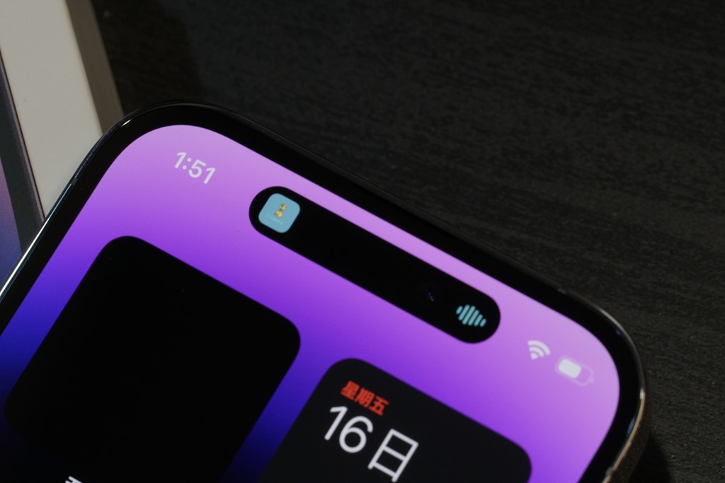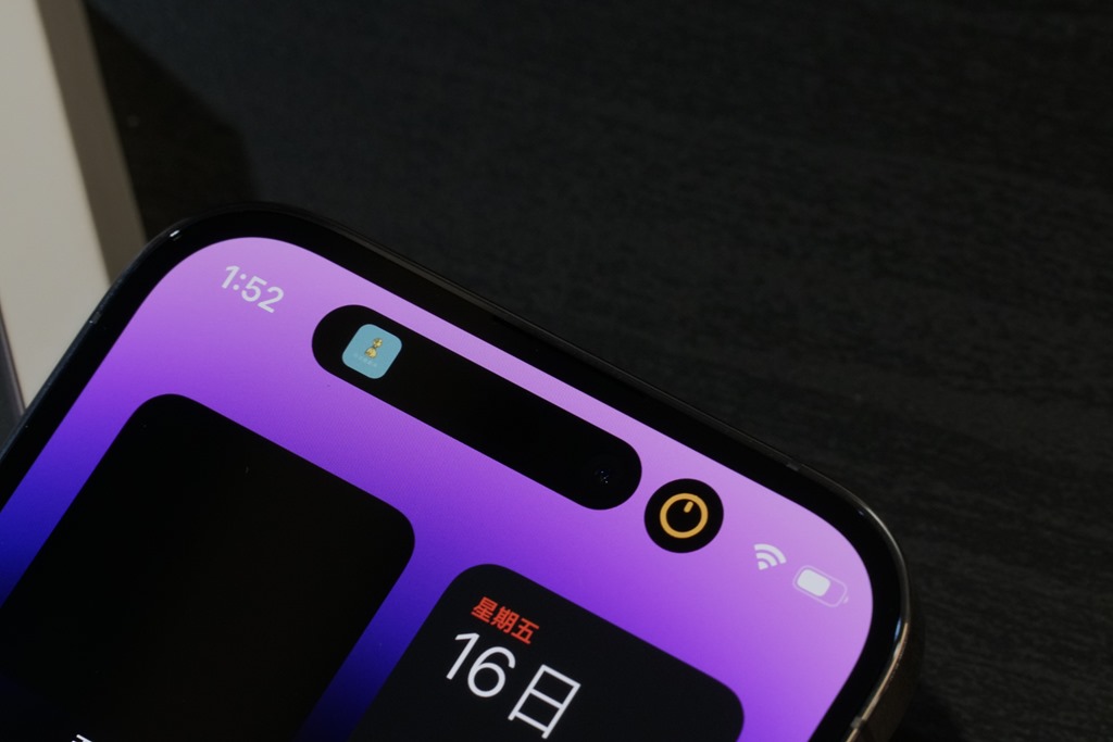 而螢幕上方膠囊形狀開口,也就是這次特色之一,所搭配的動態島也非常有趣,將原本應該是缺點的開口設計,變得生動有趣。動態島有什麼好玩的功能,等等也會告訴你。