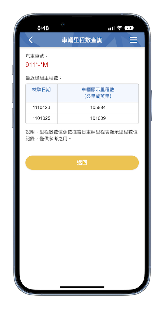 原來「監理服務 app」中除了汽機車燃料費查詢繳納、交通違規查詢繳納、考照預約報名查詢,在首頁的「車駕查詢」分類中會看到「車輛里程數查詢」,只要輸入車號與出廠年月(西元年),便會出現最近的檢驗日期與檢驗當時的里程數。