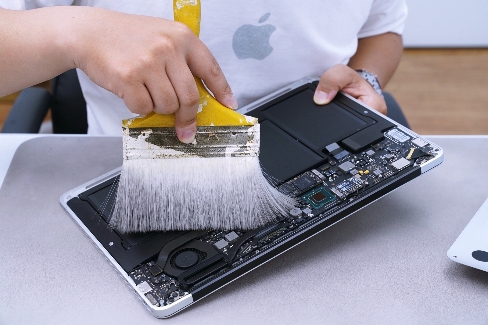 ▼只要維修 MacBook ,任一維修項目都會幫你做機內清潔,當電腦內部堆積灰塵,足以影響散熱與效能,拖慢運行度速度,一定要定時清理,可用優惠價 600 元加購更換散熱膏。