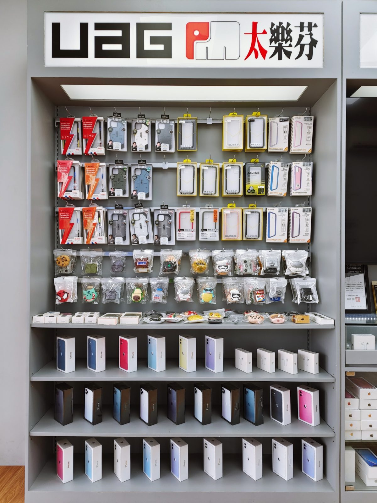 ▼配件區展售各種 iPhone 保護殼、各種品牌的防護產品,都算是大部分長期使用者會知道的知名品牌。還能協助客人預購 iPhone 新機,想買二手 iPhone 這裡也有。