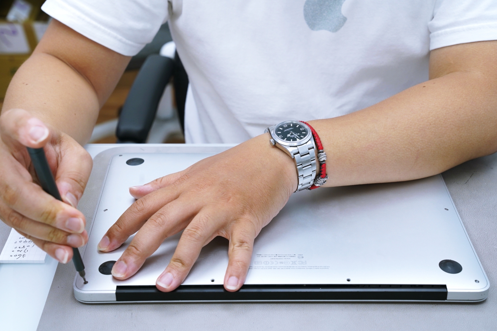 ▼目前我手上有兩台 MacBook ,一台主力機,一台備用機,所以也帶了其中一台來檢測。門市人員對蘋果各代產品的熟悉程度都很透徹,看了一下型號、生產年份就能娓娓道出這台筆電有哪些特性、分析其優缺點,提醒我使用時該注意什麼事情。
