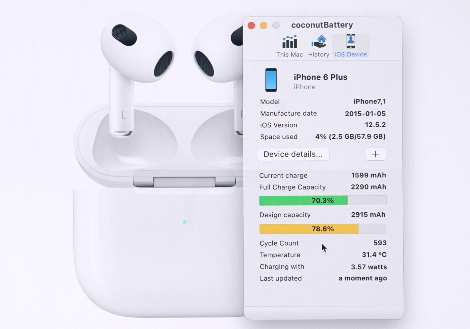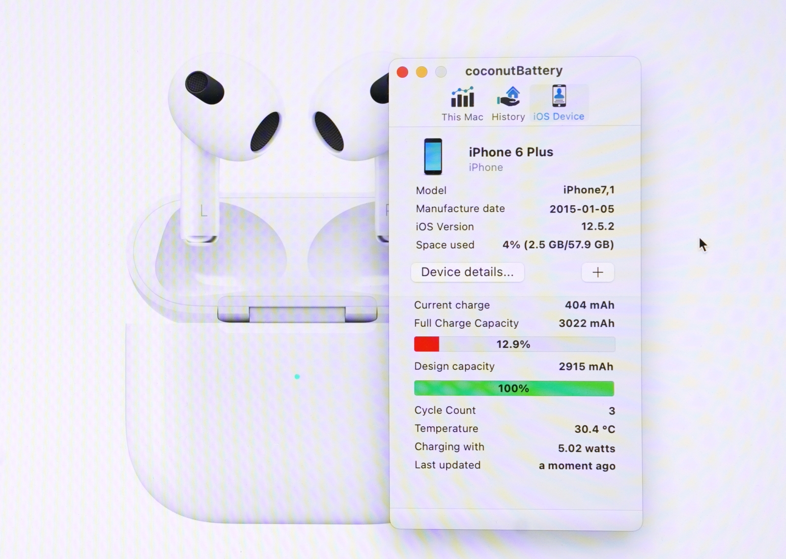 ▼以正在檢測的這台 iPhone 6 Plus 電池設計容量(Design capacity)為 2,915 mAh,完全充電容量(Full Charge Capacity)為 2,290 mAh,兩者相除後為 78.6 % 蓄電量,雖然仍是堪用,但是隨著一次又一次的充放電,電池蓄電量會持續遞減,故仍要定時檢測並追蹤,否則會感受到電池越來越不夠力。
