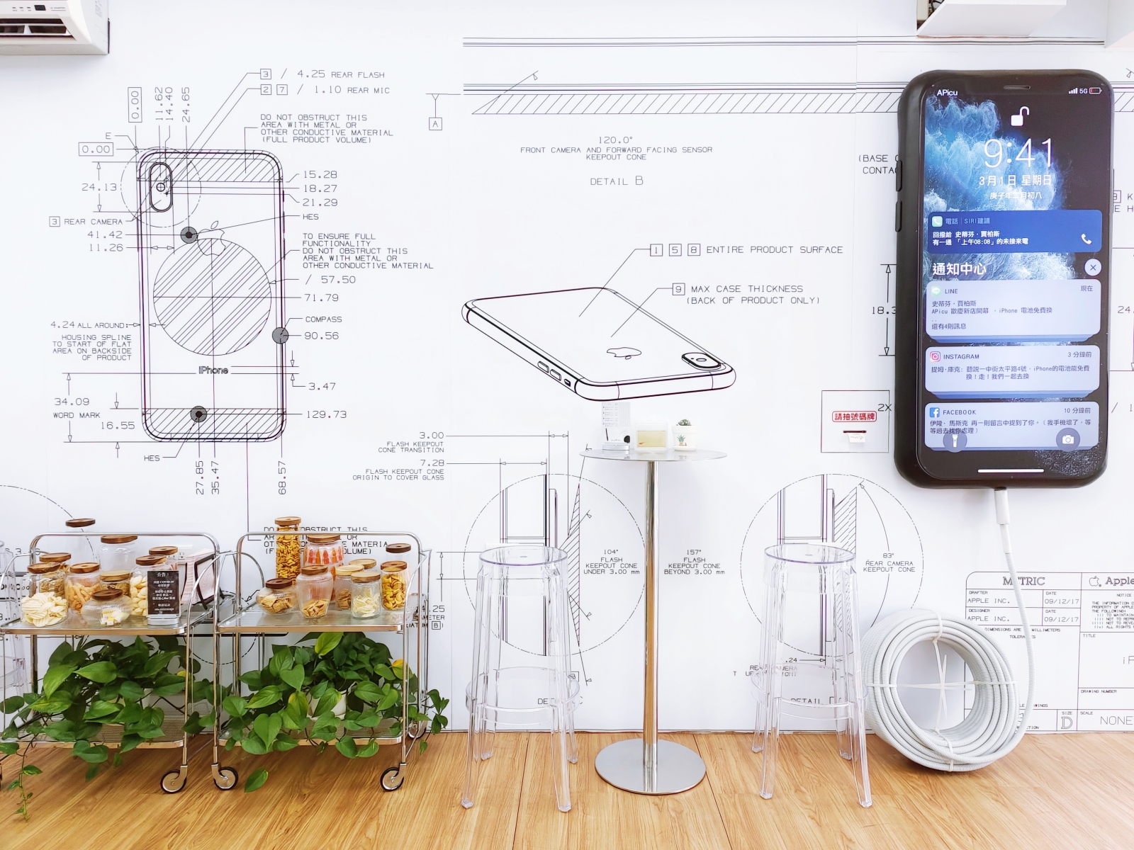 ▼店內牆面 iPhone 的機構圖,更提升專業感,與固定在牆面,十倍比例大的 iPhone、充電線,是店家與設計師討論出的設計巧思,很多到店客人都會在此拍照打卡。