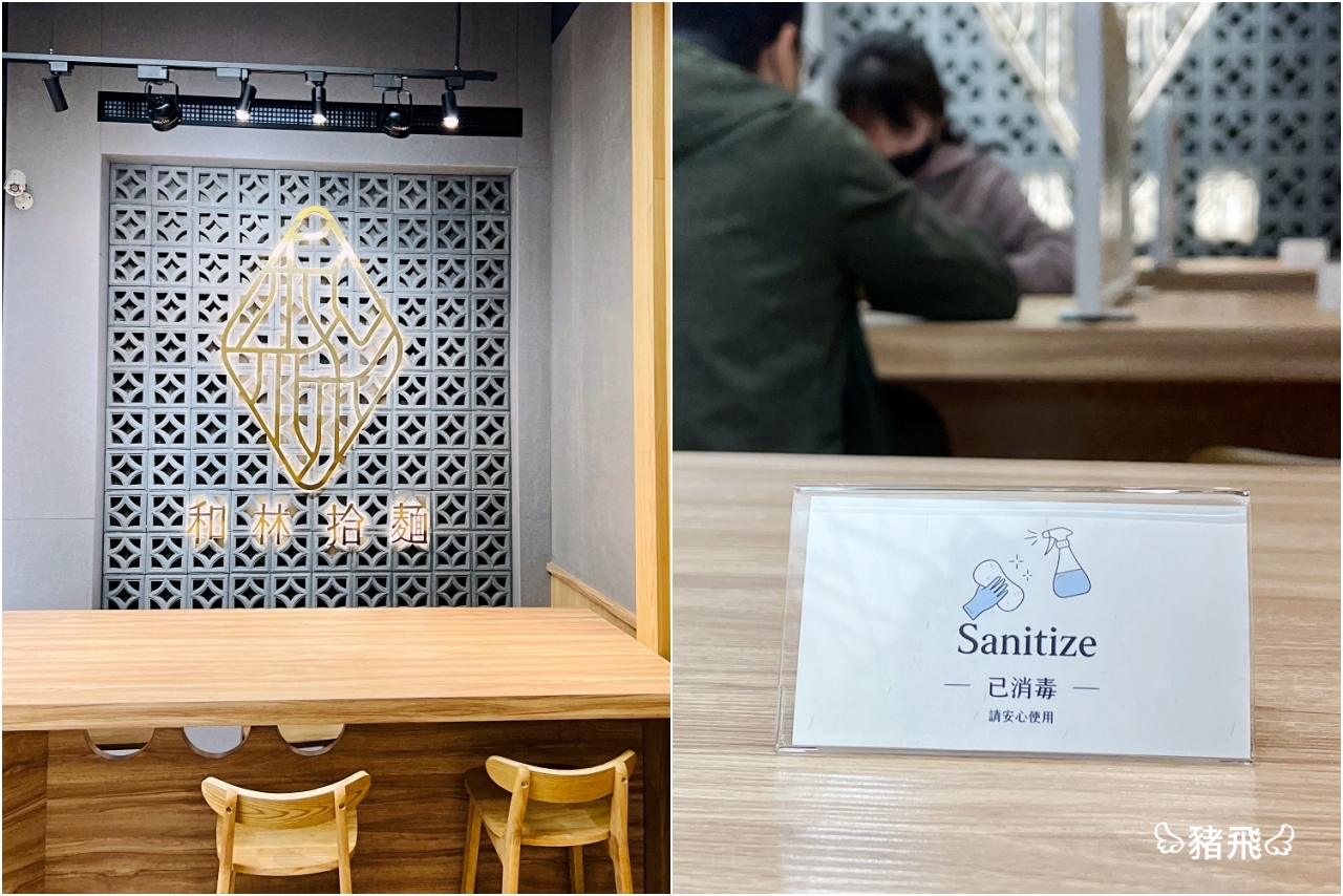 ▲一樓是高腳椅座位區,走到最底有一面非常適合打卡拍照的品牌牆,很難想像這是一家麵店吧!第一次來我以為是咖啡館呢。桌面放上「已消毒」的牌子,每位客人用餐離開,店家都會立馬做消毒再擺上說明小牌子,讓人感到好安心。