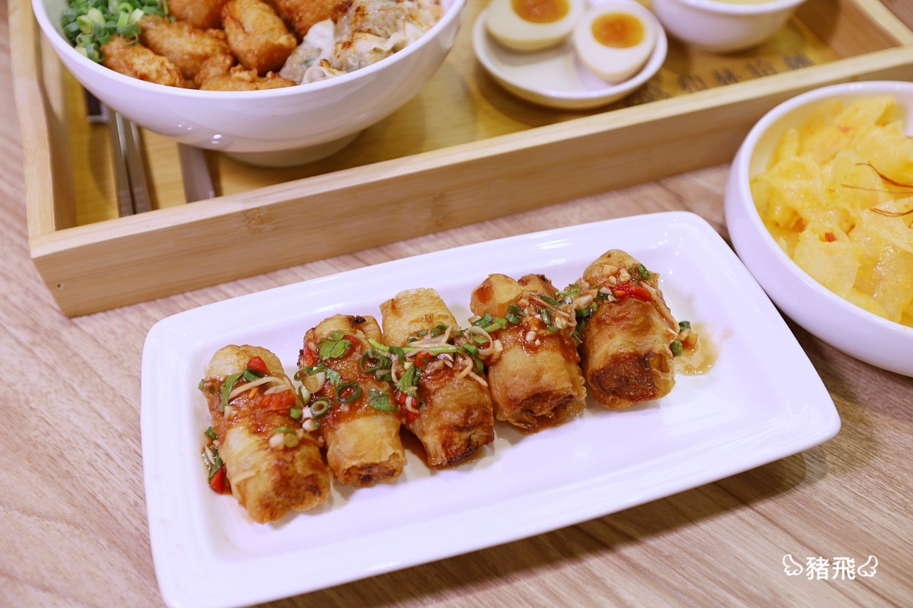 金黃花枝酥配上滑嫩飽滿雲吞,海陸雙拼大滿足!花枝酥每一顆都咬的到飽滿彈牙花枝塊,需要趁熱吃才能品嚐到外酥內嫩的口感,薄皮雲吞吃的到內餡的鹹香鮮甜,搭配椒麻醬、老菜圃、油條、辣椒絲、蔥花,別看這只是料多十足的樣子,絕對是味蕾的衝擊,鮮香迷人。