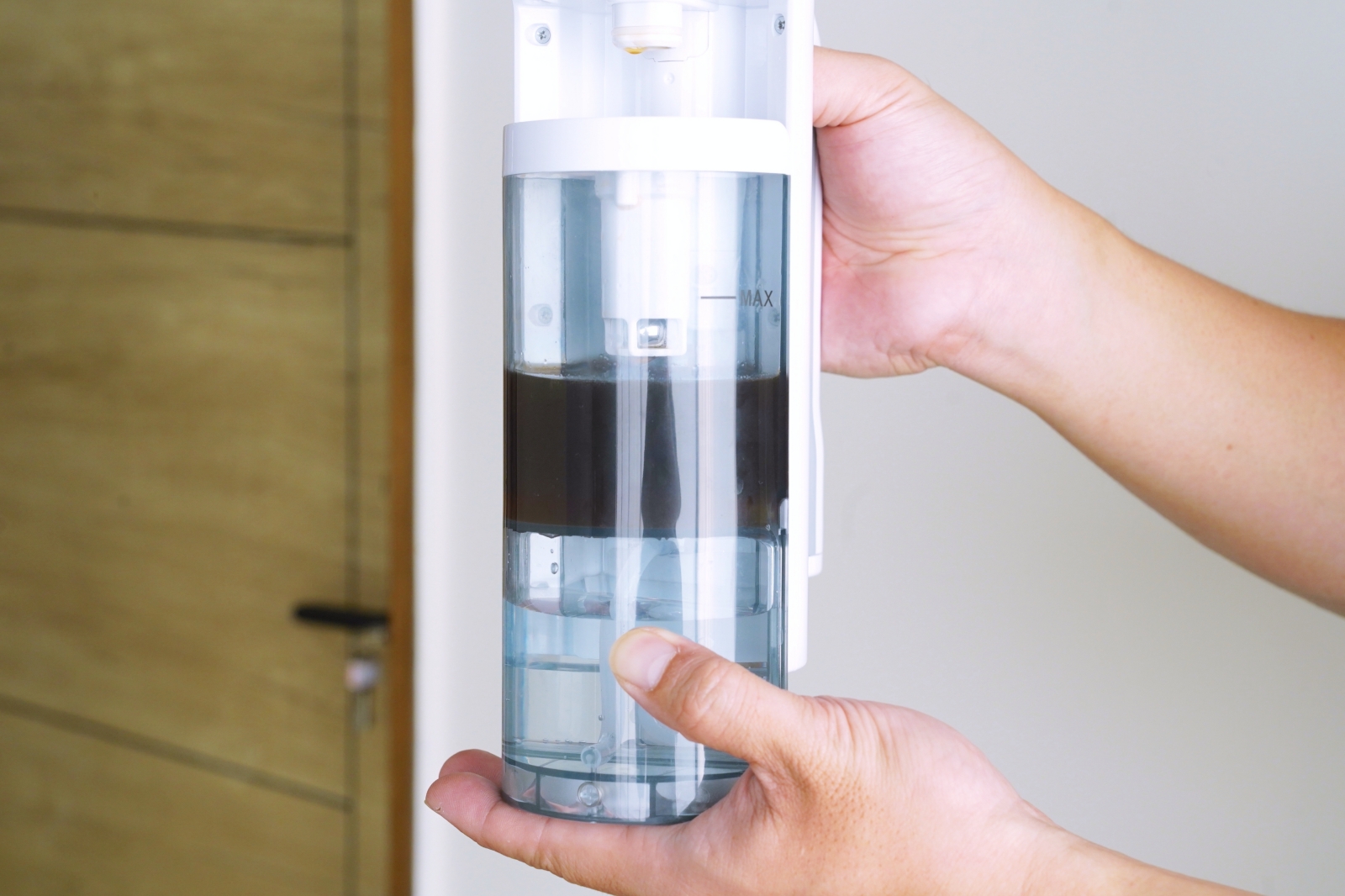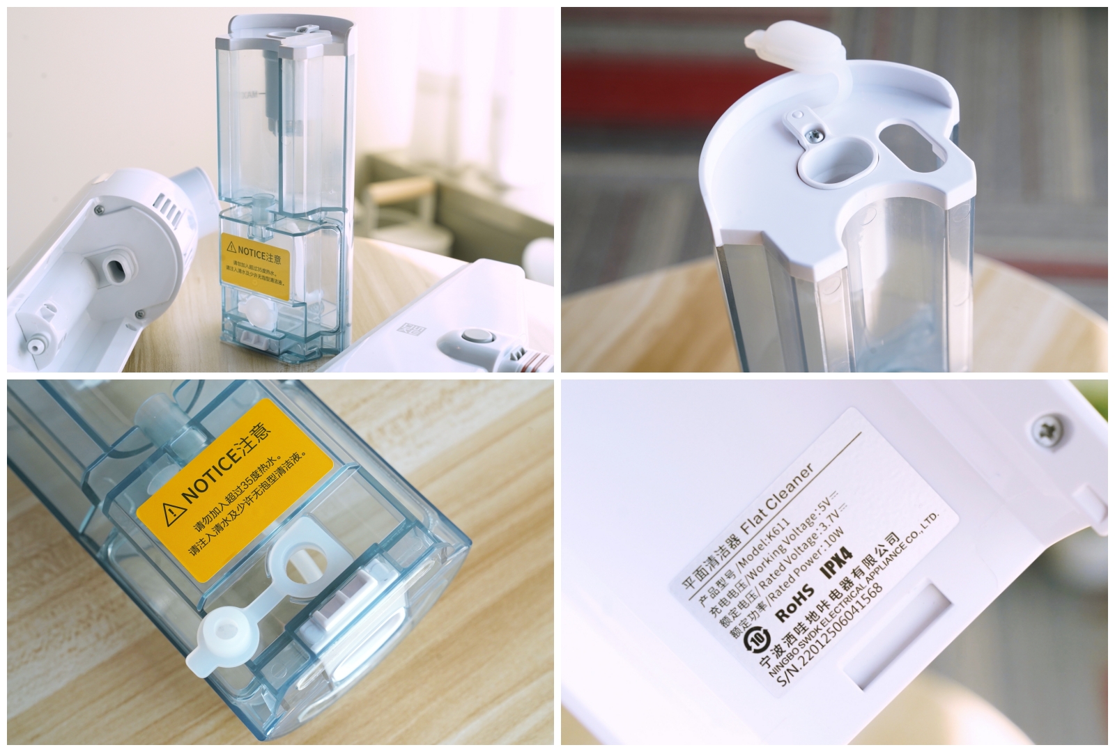 ▼水箱分成兩格,上方是污水箱,下方是淨水箱,污水箱 260ml 比淨水箱多 80ml 的設計很合理,因為清潔後的污水多少帶有雜質,需要多一點的容量。可視需清潔的區域、材質注入清水或清潔液,注意要注入中性且無泡的清潔液,也不可注入高於 35 度C 的水。