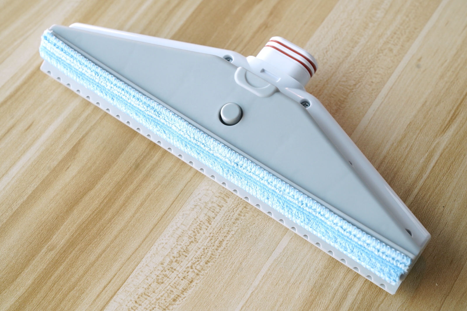 ▼刮頭抹布組件上的圓形按鈕是鎖扣,用來拆卸或是安裝主機,平常沒使用時也利於收納。