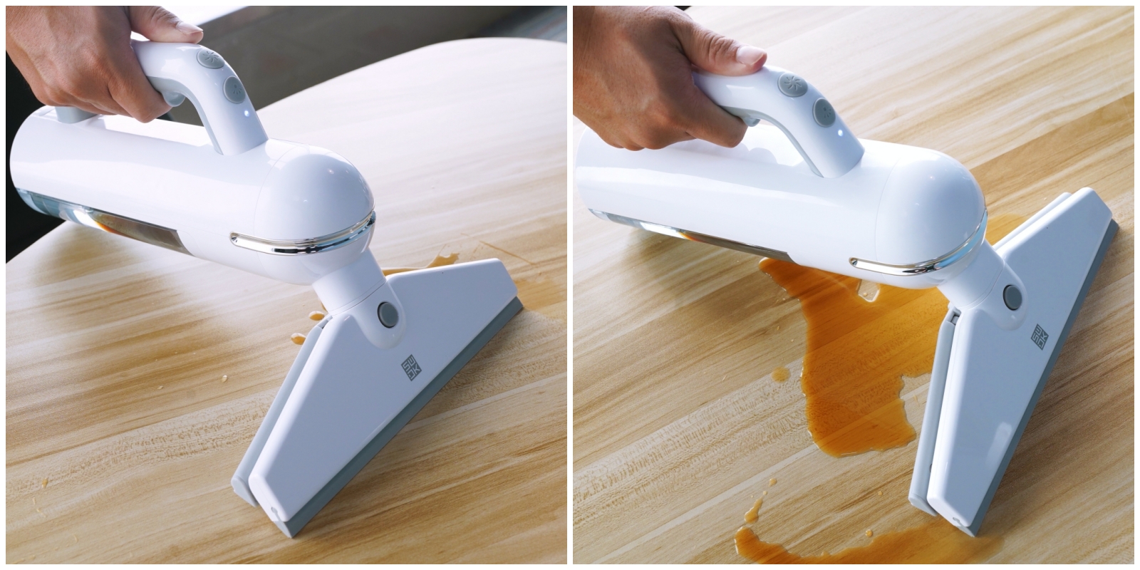 ▼把手與清潔平面呈現平行時,清潔污水效果最好。其實就像平常用抹布清潔表面的流程一樣,用水沾濕抹布、擦拭表面,都是以平常使用者清潔的流程去設想、研發,提升實用性。