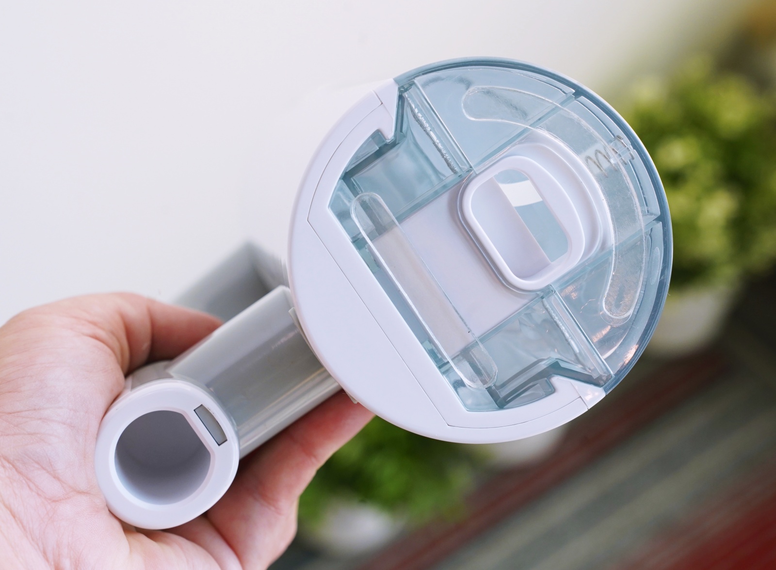 ▼產品比實際想像中的小巧,未儲水時的重量是一公斤。機身上只有兩個按鈕,分別是噴水按鈕、電源/吸水按鈕。操作上直覺、方便。
