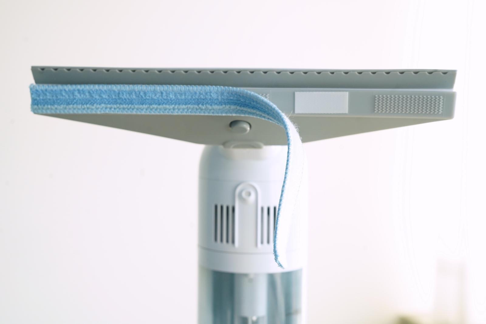 ▼一條抹布黏在抹布架上,一條附在包裝盒內,想要更多組替換時,加購價為 2 條 199 元。抹布上方圓形按鈕是抹布架調節按鈕,可將抹布架往前推移。