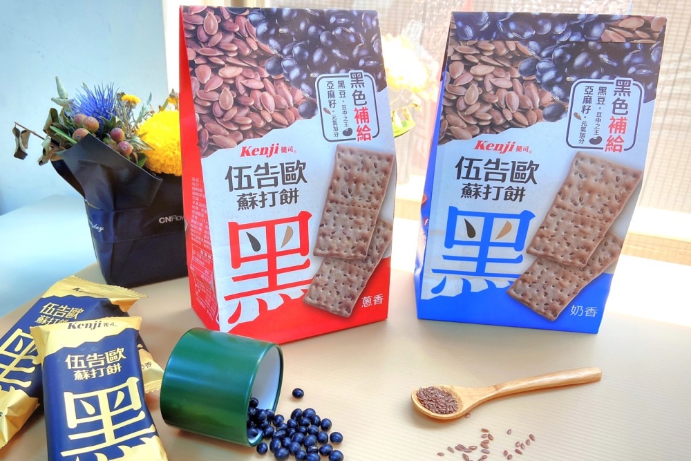 伍告歐蘇打餅除了充滿黑豆香氣的爽脆口感,還有蔥香及奶香二種口味,推薦給喜歡鹹味零嘴的朋友們,今年秋冬就以黑色補給,幫你元氣加分。