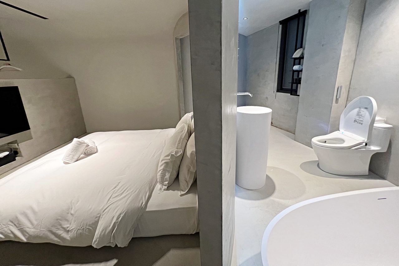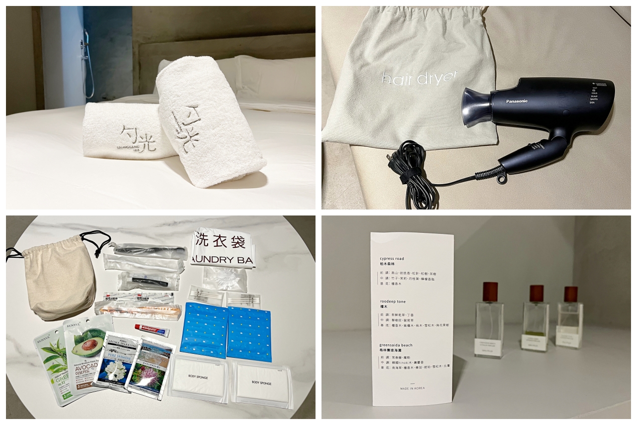 房間裡以無隔間的方式讓視線穿透,圓弧型線條把這個空間呈現的更可愛有溫度,值得一提的是,浴室與房間是完全通透的,無門無隔間,一般朋友來尷尬度會破表,比較適合情侶入住。備品給的很大器,基本備品的洗沐用品之外還有沐浴鹽、面膜、衛生棉,吹風機是國際牌的,最特別的是房間內提供韓國香氛品牌OWNROOM 的三款香氛讓客人使用,喜歡的話還可以購買喔。
