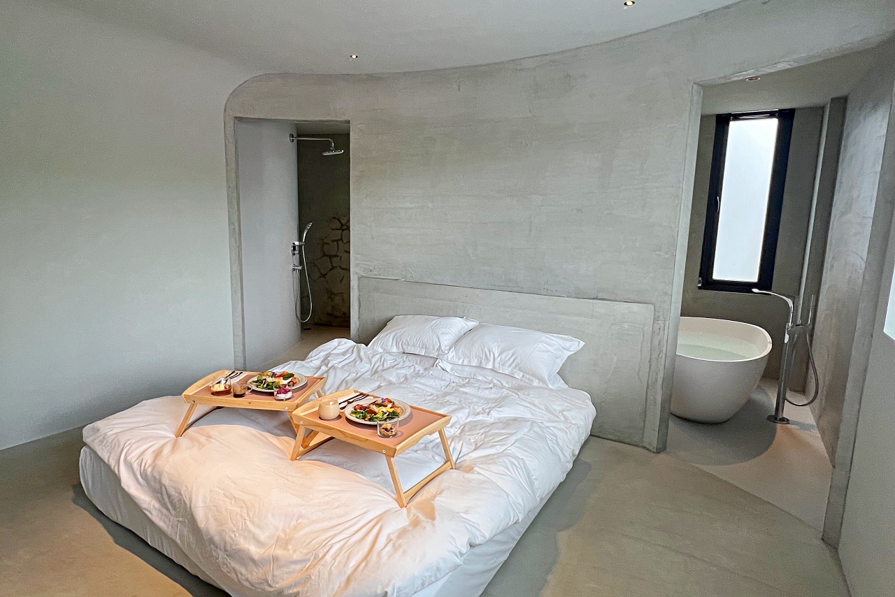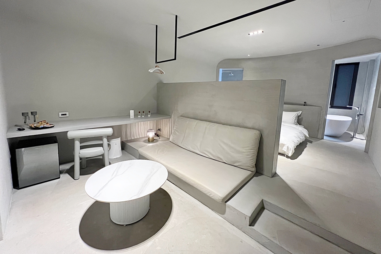 「山久蒔x勺光」2022年初開幕,開幕到現在常常是一房難求,更是IG上超夯民宿推薦名單之一!以純白色建築與圓弧造型打造的房間是民宿一大特色,總共有五間雙人房,分別為「山眠」、「蒔春」、「久居」、「光隅」、「勺日」,每間房皆寬敞舒適,有Netflix、Disney+與Youtube premium、浴缸、窗景、完整備品、質感灰白牆面、浴缸,在官網上瀏覽時候就被每個房型的照片給深深吸引,以質感風格的取向,配上日月潭山中美景,在純樸的魚池鄉是話題性最高的特色旅點。