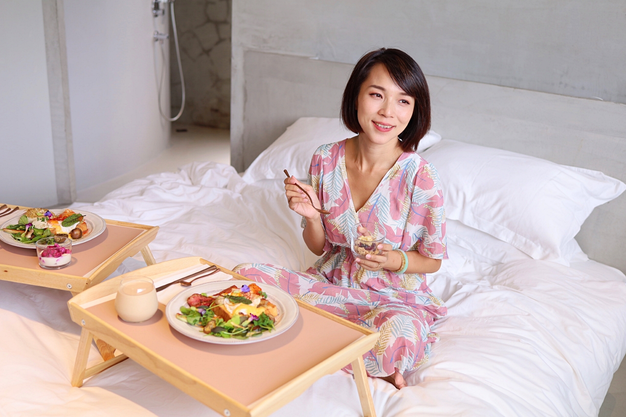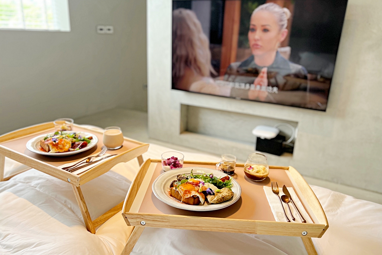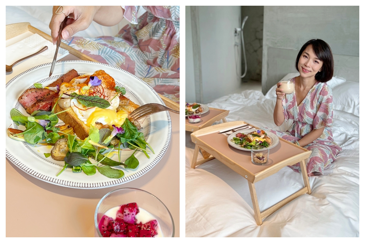 早餐可以選擇在餐廳或是房間用餐,終於實現在床上吃早餐的願望了!來到這裡度假就不要匆匆忙忙起床梳洗了,直接在房間用餐才舒服。管家會在前一晚先確認早餐組合,隔天早上在約定時間用LINE通知送餐,接著就把餐點送到房間裡,實在是好貼心。
