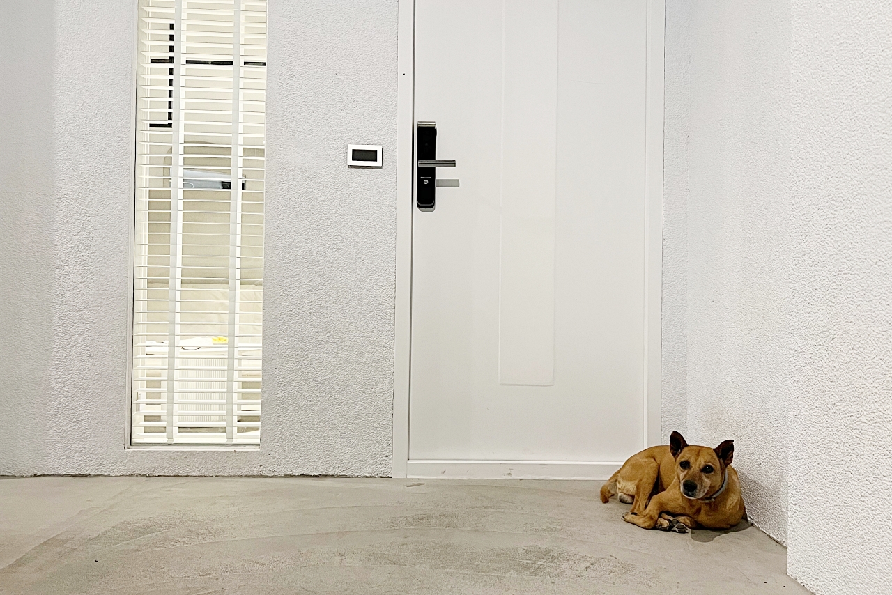 ▲ 守在房門口的小黃狗是民宿的一員,非常乖巧不會亂叫,平常時間會在民宿散步。