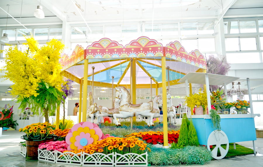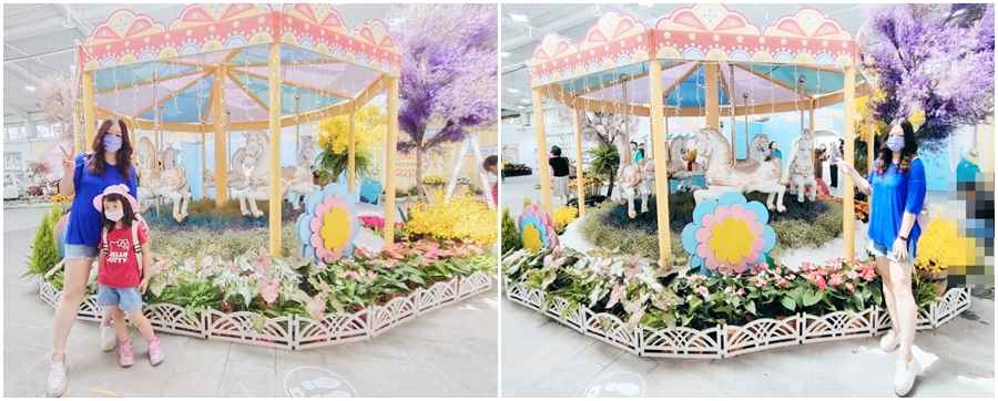 ▼這一區不管哪個角度都超級漂亮~拍起來有不一樣的美感,加上繽紛又多元的花卉展示,沒想到跟童趣的旋轉木馬也有如此完美結合!