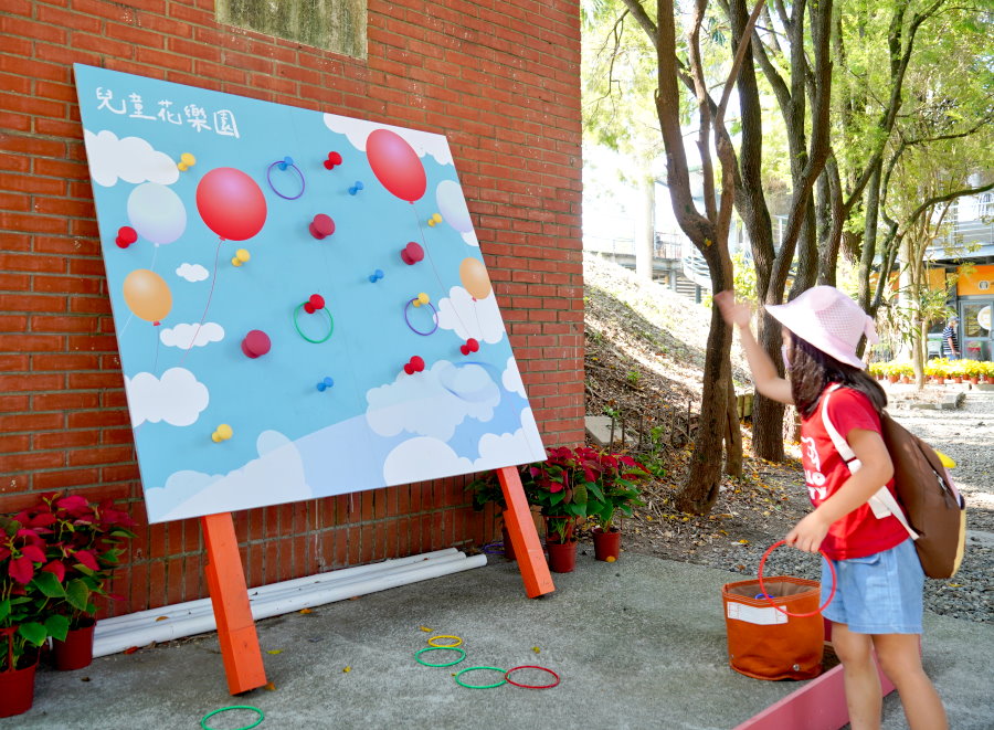▼一旁還有不少親子互動的設施,讓大家不僅有美美的花卉可供欣賞,還可以來玩一圈~像是套圈圈就很有挑戰,小口妹光是這一關就玩了超級久,從一次丟1個圈圈到後來直接丟10來個比較快,可說是比夜市還好玩啊(笑)!