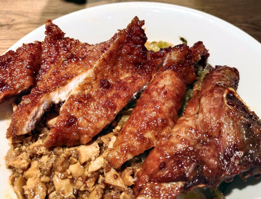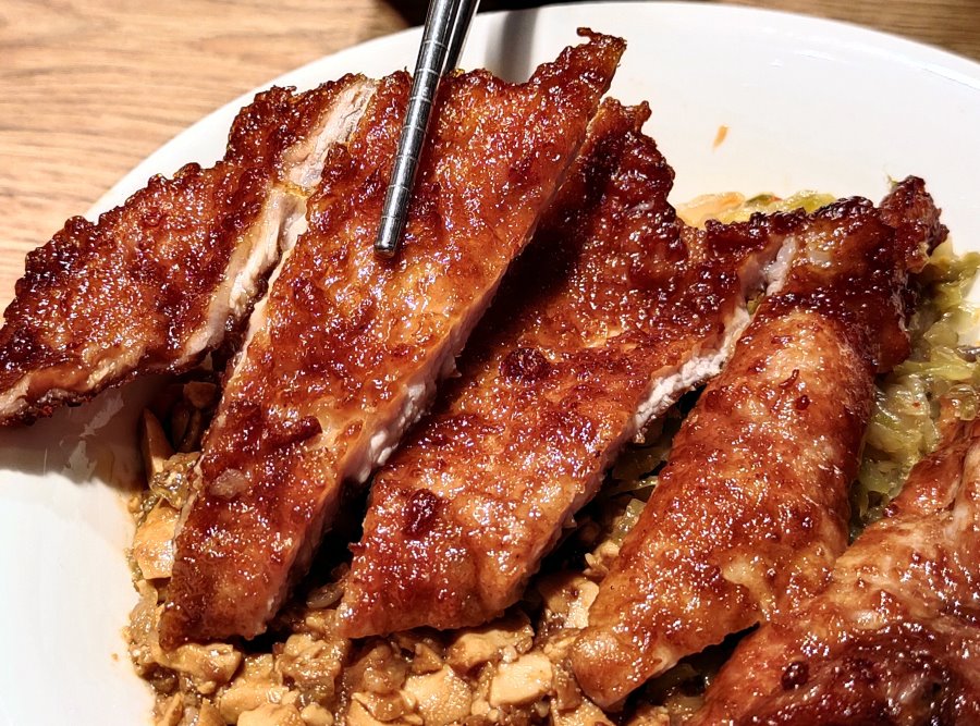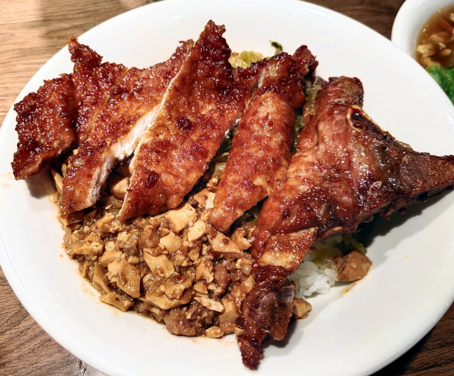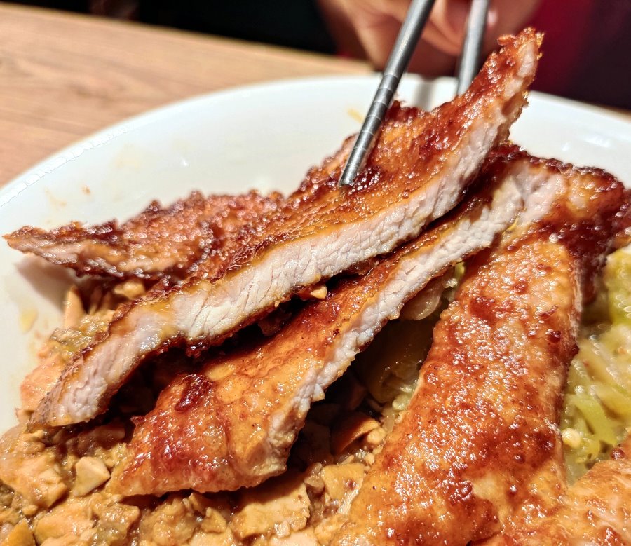 ▼上頭的排骨採用台灣CAS溫體帶骨豬排,帶點深褐色的輕薄麵衣,油油亮亮的好誘人!