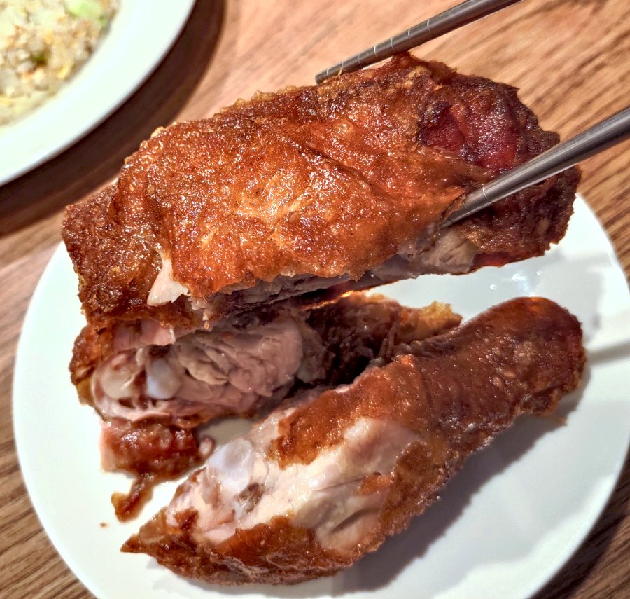 ▼雞腿採用台灣CAS冷藏級九兩大雞腿,裹上一層薄粉後下去酥炸而成,吃起來外皮薄酥香脆,肉質香嫩軟Q,還帶點討喜的肉汁與醃料香氣,吃起來口味也不會過重,相較於排骨來說,雞腿反而更讓我們驚艷~覺得很可以耶!
